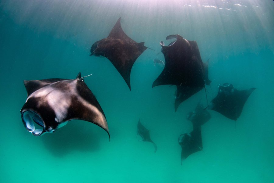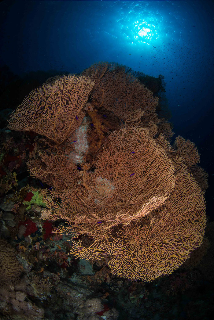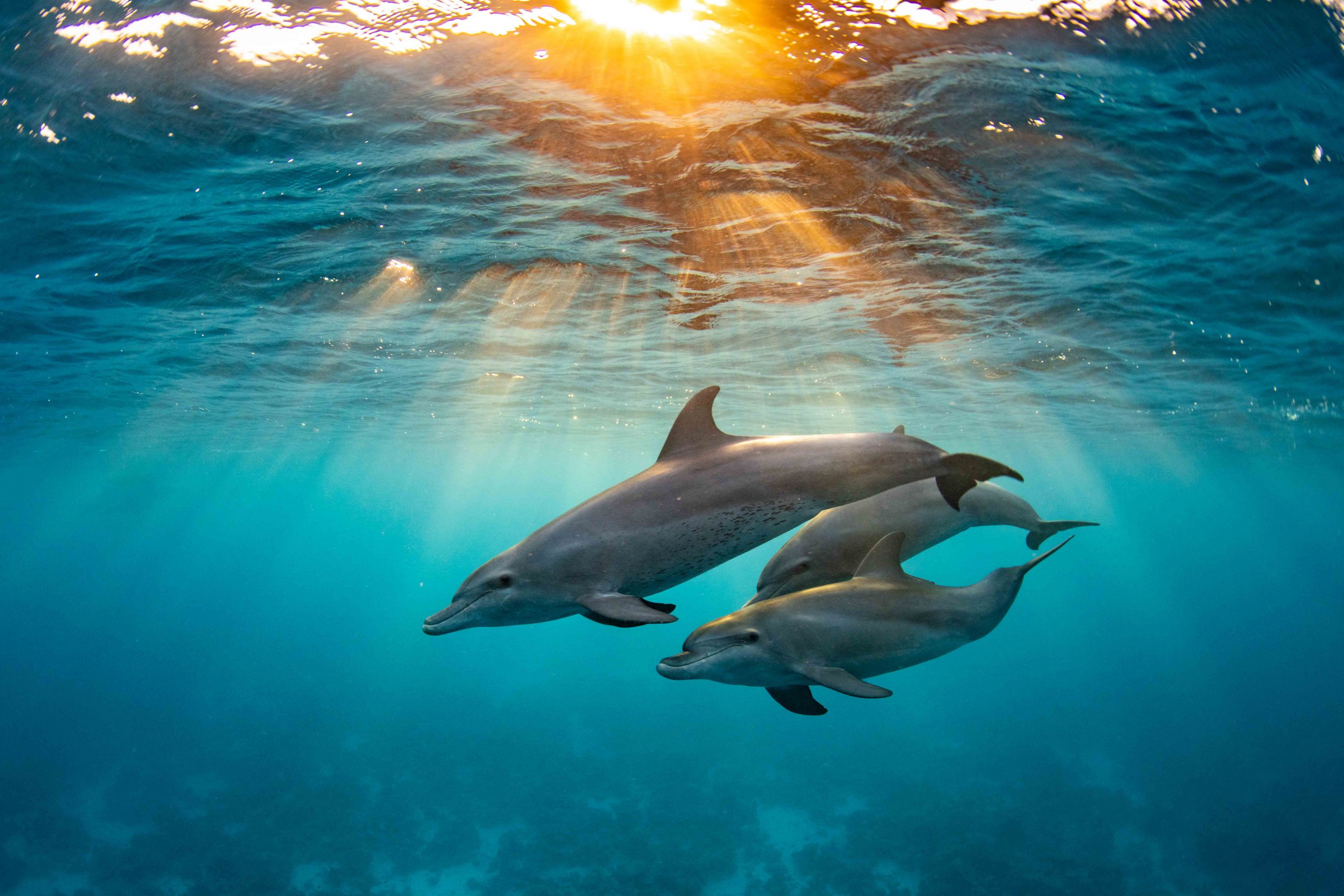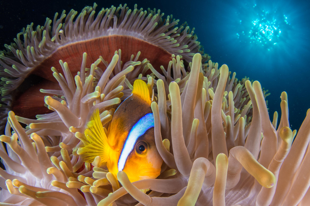 Sullo sfondo, uno sciame di pesci nuota leggero, mentre i raggi di luce penetrano la superficie dell’acqua, creando un effetto etereo.