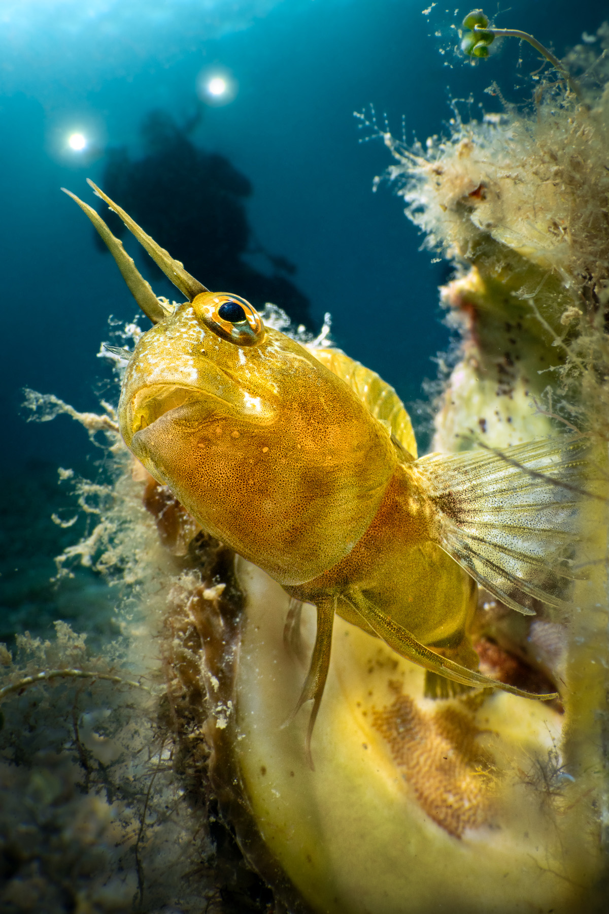 “1…2…3…Stella!!!” Cattura un momento di pura curiosità in un mondo sommerso. Una piccola bavosa, con le sue tipiche antenne sopra gli occhi e il corpo dorato, sembra immobilizzarsi per un istante, come se stesse partecipando a un gioco. Lea posa curiosa, con lo sguardo fisso verso l’alto, evoca un senso di attenzione e stupore. Sullo sfondo, la silhouette di un subacqueo con due luci che ricordano vagamente occhi vigili, aggiungono un tocco di mistero e profondità alla scena. La combinazione di dettagli ravvicinati l’ambiente più vasto crea un’immagine affascinante, che racconta l’incontro tra la vita marina e l’osservatore umano, in un gioco di sguardi e luce.”