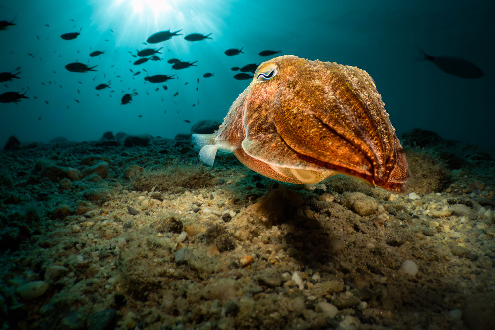 “Rays” ritrae una seppia che, con il suo corpo robusto e sfumato nei toni del marrone e del bronzo, sembra scrutare attenta l’obiettivo.