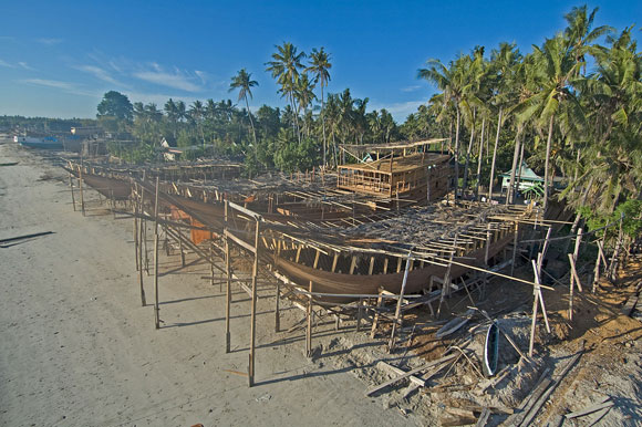 Può essere difficile credere che nel 2008 siano strumenti interamente manovrati a mano e l’occhio del capocantiere a dare forma a un sogno, che nasce come Venere su una spiaggia bianchissima, lambita dalle onde dell’Oceano, ai margini della foresta. Eppure è così: qui in Indonesia, nel più grande arcipelago del mondo, le mani dell’uomo lentamente, con azioni precise, ritmate e sempre uguali da tempi antichissimi, danno forma al legno della foresta, uno dei beni più preziosi di queste terre, trasformandolo in nave.