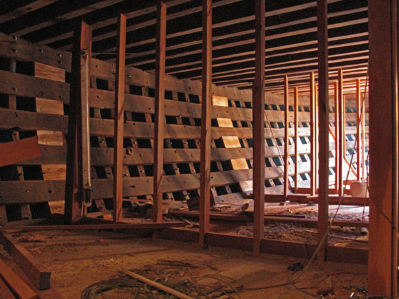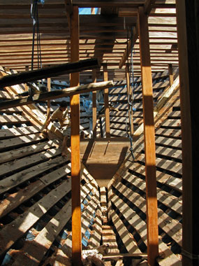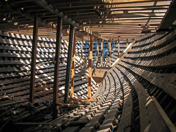 Foto a destra: La “pancia” di Aurora, con il secondo fasciame all’interno.