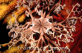 Nella foto: una rara stella gorgonie abbracciata al ramo di una gorgonia con le sue appendici digitate. Solitamente non la si rinviene a profondità inferiori ai 45 metri. |