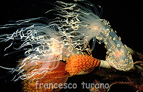 Nelle foto in alto: un esemplare di Alicia mirabilis a sx e una coppia di Pennatula rubra a dx.