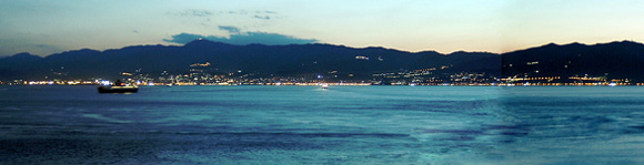 Nella foto un panorama crepuscolare dello Stretto di Messina, con la Sicilia vista dal versante calabro in prossimità di Punta Pezzo (Villa San Giovanni). Le correnti di marea di questo braccio di mare sono un elemento che il subacqueo deve sempre tenere in grande considerazione.