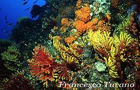 Questa è una caratteristica costante dei fondali dello stretto, quasi sempre profondi in prossimità della riva. Molte immersioni sono così possibili partendo comodamente da terra e senza l’ausilio di natanti. Tornando alla nostra franata di roccia, noteremo che questa termina la sua corsa intorno ai trenta metri di profondità, dove lascia il posto alla sabbia e al detrito. Da qui in poi, su un fondale fatto di valloni scoscesi e pendenti verso il mare aperto, si innalzano all’improvviso grandi montagne sommerse. Il colore dominante di queste grandi rocce (le secche di Scilla) è giallo-rosso, per via di un celenterato coloniale particolarmente bello e abbondante in questi luoghi: la gorgonia Paramuricea clavata. Un fondale mediterraneo così colorato non lo si trova con facilità.