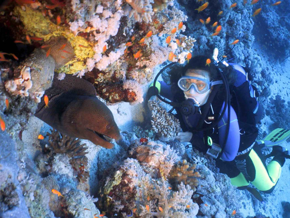 La barca si ormeggia a ridosso mentre noi equipaggiati di tutto punto saliamo sul gommone che ci porterà sullo specchio d’acqua sovrastante il transatlantico italiano.Ci ormeggiamo sulle gruette delle scialuppe di salvataggio che affiorano sulla superficie del mare quasi a volere mantenere ancora un legame con il mondo terrestre. L’impatto con il mare è fantastico, caldo , cristallino e popolato di vita in ogni direzione in cui si rivolga lo sguardo. In un primo momento non riesco a riconoscere lo scafo della nave , da tanto è tappezzato da organismi che lo rendono coloratissimo, rivestito da ogni specie di gorgonia , rami di corallo e enormi alcionari.