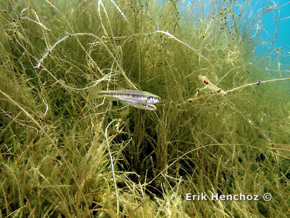 Esemplari di sanguinerola (Phoxinus phoxinus Linna) nuotano tra le piante acquatiche del fondale del lago Verney