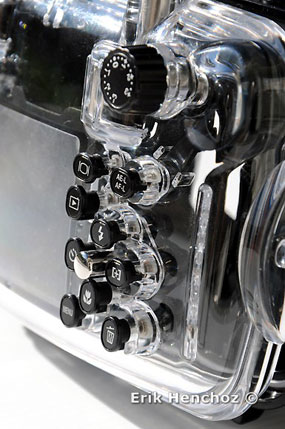 A sinistra: particolare del pulsanti del dorso della custodia subacquea