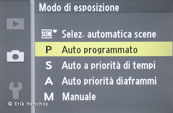 Il menu di Nikon 1 J1 dedicato alla gestione del Modo di esposizione. Selezionato in giallo il modo “Auto programmato” (P).