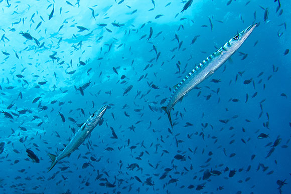 Due Sphyraena viridensis (Barracuda) in mezzo a una nuvola di Chromis chromis