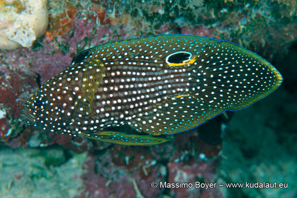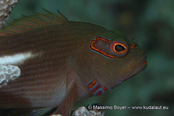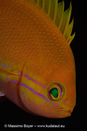 A sinistra: Pseudanthias pleurotaenia, femmina, con occhi decorati da antico egizio.