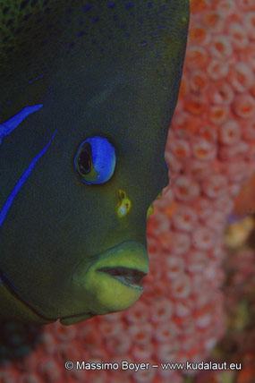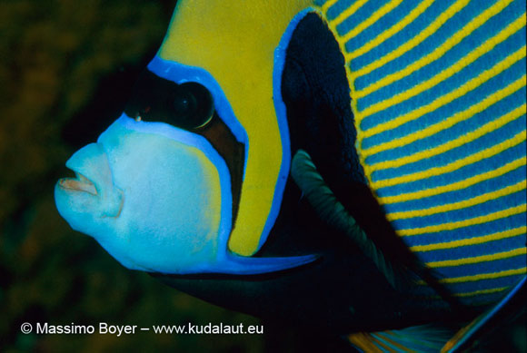 A destra: L’irreale ombretto azzurro del pesce angelo Pomacanthus semicirculatus.