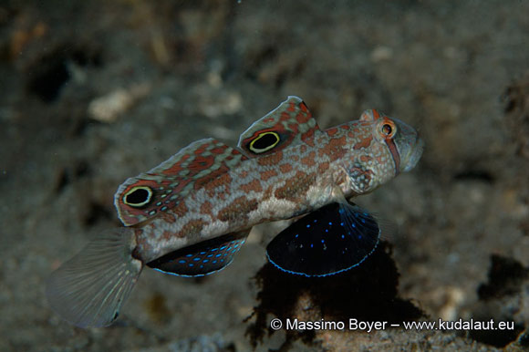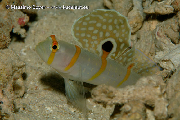 Il falso occhio sulla pinna dorsale del ghiozzo Amblyeleotris randalli, dá l’illusione di un animale più grosso del reale.