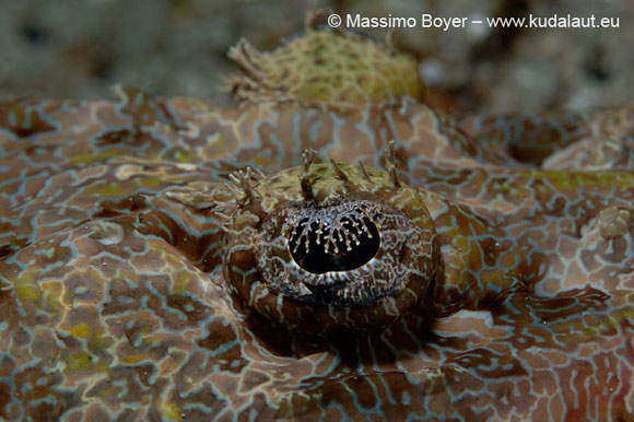 L’occhio del pesce coccodrillo Cymbacephalus beauforti, nascosto da frange come ciglia finte.