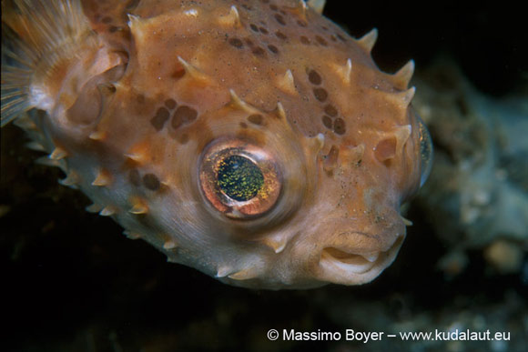 Cychclichthys orbicularis, un pesce istrice, ha occhi enormi e cornea con un filtro iridescente che migliora il contrasto nella visione in acque torbide.