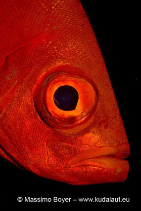 A sinistra: Priacanthus hamrur mostra il tipico occhio grande delle specie notturne.