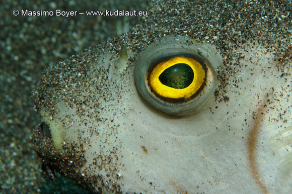 Il pesce palla Arothron manilensis ha cornea gialla per rendere la visione più ricca di contrasto in ambiente fangoso.