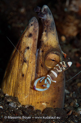 A destra: La cura dell’occhio: Ophichthus melanochir e il gamberetto pulitore Periclimenes magnificus.