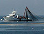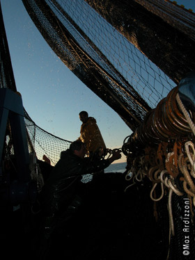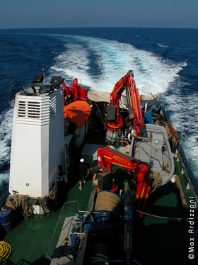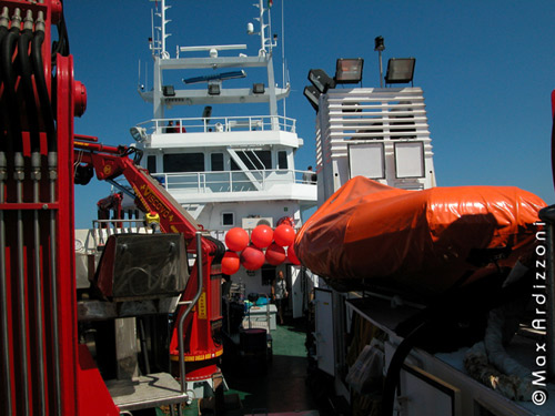 In bella mostra sono evidenti gli schermi a colori di radar, ecoscandagli, sonar, GPS cartografici, con affiancati i sistemi di comunicazione. Se poi il vostro occhio è abituato a cercare la ruota del timone, rimarrà deluso nel constatare che non viene più usata da tempo, oggi la si mantiene solo per emergenza, mentre l’imbarcazione viene pilotata esclusivamente con un joystik accoppiato al pilota automatico. Insomma sembrano del tutto tramontati ormai i ricordi romantici dei capitani di un tempo, con le mani piantate sulla ruota e l’occhio incollato alla bussola! Mi accomodo nella plancia di comando per seguire meglio l’andamento della battuta di pesca, anche se, la prima parte può sembrare un po’ noiosa in quanto si tratta di scandagliare continuamente il mare, senza soste, senza pause.