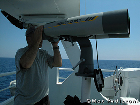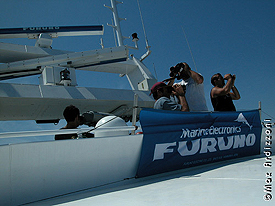 La mia imbarcazione è tra le più veloci in assoluto di tutta la flotta e lo dimostra senza timori; il comandante mette quasi a manetta i due motori e la barca reagisce lasciandosi di poppa una scia ribollente che morde l’acqua. Il fragore che ne scaturisce è assordante, lo si può sentire fin sopra il fly, ma nessuno sembra farci caso più di tanto ormai. Nel frattempo l’equipaggio si dispone ognuno al suo posto di lavoro; chi a prua pronto per pasturare, chi a bordo della lancia, chi al verricello. Seguendo le indicazioni dell’aereo, si arriva in prossimità del branco, a questo punto entra in azione anche il sonar, questo, per rendersi conto delle dimensioni e della posizione esatta, ma qualche cosa non convince, lo si nota dall’espressione dubbiosa del comandante mentre cerca di interpretare le macchie colorate sul monitor.