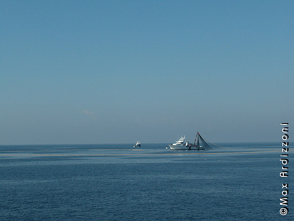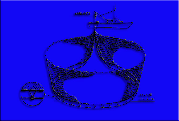 Ad un urlo del comandante o canotto ( la lancia, nda ) viene mollato a mare dalla scivola; servirà a tenere i due capi dell’inizio della rete. A questo punto l’imbarcazione procede a velocità e comincia a descrivere un’enorme cerchio intorno a quelli che stanno pasturando, lasciandosi dispiegare ordinatamente alle spalle poco più di duemila metri di rete. Dall’alto della mia postazione riesco a scorgere la precisione, nella chiusura dell’enorme cerchio, quando la barca si ricongiunge col canotto; la scena rende perfettamente l’idea di cosa voglia significare una rete a circuizione.