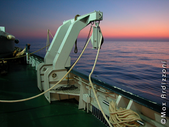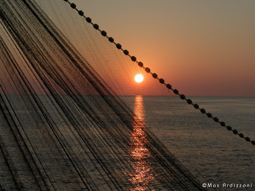 Si comincia a pasturare per richiamare i tonni, il menu di oggi prevede sarde, come sempre del resto, le ombre scure si fanno sempre più vicine, cominciano i primi spruzzi, stanno mangiando! Ecco cosa non convinceva prima, il branco che abbiamo individuato è composto da pesci di piccola taglia, troppo, per di più è anche abbastanza ridotto come quantità, non si possono prendere e non ne vale neanche la pena. Pazienza, bisogna ingoiare il rospo ed andare avanti sperando che vada meglio. Proseguendo con le ricerche il tempo vola che neanche ce ne accorgiamo, è tardi e la barca si ferma per la nottata, si spengono i motori e di colpo regna la pace. Come d’incanto mi ritrovo in mezzo al canale di Sicilia con il mare liscio come l’olio, nel silenzio più totale, solo un flebile ronzio del generatore, ma non distoglie la mia attenzione dal tramonto spettacolare, colorato con tutte le sfumature del rosso e del giallo.