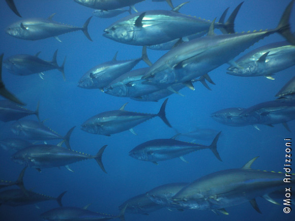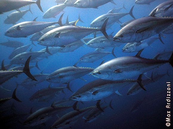 Centinaia di sguardi che convergono su di me, mi sembra di essere osservato, la sensazione è strana perché generalmente gli occhi dei pesci non sono molto espressivi, ma qui la situazione è diversa. Sembrano quasi volermi invitare, mi pare di nuotare come loro, anzi è qualcosa di più, è come una danza, un valzer; mi vengono in mente le note del Danubio Blu e comincio a girare al tempo di una musica immaginaria. Rimango talmente ipnotizzato che mi dimentico di scattare subito delle foto, poi, di colpo mi sveglio e mi rendo conto di dove sono, attimi che sembrano eternità. Sono veramente grossi, stimo il loro peso, sembrano di oltre duecento chili e mi stanno passando a mezzo metro, alcuni riesco a sfiorarli, consapevole del fatto che una loro scodata mi potrebbe fare un po’ male, ma la tentazione è troppa! Stavolta il tempo passa velocemente, giusto il tempo di fare gli ultimi scatti poi, via velocemente verso il varco esterno, con un ultimo sguardo dietro a ciò che mi sto lasciando. Già che ci sono ne approfitto e faccio un giretto sotto la chiglia, tanto per vedere le due eliche gemelle. Tutt’ intorno adesso è di un blu indescrivibile, sotto, centinaia e centinaia di metri di Mediterraneo, sopra, la sagoma della barca che si staglia maestosa sopra la mia testa. Mi chiedo cosa ci sia la sotto, chissà, forse, ma sono troppi per chiunque, chiudo per un attimo gli occhi e mi fondo nell’acqua, emozioni infinite. Come per tutte le cose belle, anche questa ha una fine purtroppo; comincio la risalita malvolentieri, avrei voluto stare ancora un po’ in loro compagnia, ma mi devo accontentare per oggi, perché comunque è stata un’esperienza fuori del comune e ne sono felice che sia toccato a me. Neanche il tempo di mettere la testa fuori dall’acqua , che mi ritrovo tutti i marinai appoggiati alla murata in evidente attesa del mio ritorno, vengo immediatamente subissato di domande, quanti sono, quanto sono grossi, ecc. L’euforia è tanta, anche perché già si vocifera che questa è stata una buona cala (pescata, nda). A fine operazioni, dopo una bella sciacquata di tutta l’attrezzatura, do una controllata alla ripresa fatta, chissà perché sono attimi di dubbi, poi, finalmente appaiono le immagini, sono perfette; cominciamo a contare i tonni, ne risultano poco meno di centottanta, sono soddisfatto, mi posso finalmente riposare. Ripensando all’immersione di oggi, a livello di emozioni, mi viene di paragonarla a tante altre fatte in giro per il mondo; ho incontrato squali di ogni genere ed ogni dimensione, branchi di barracuda che quasi oscuravano la superficie, muri di azzannatori e tanto altro ancora, ma oggi penso di poter aggiungere senza dubbio questa tra le immersioni da ricordare. Nell’arco della stagione durata circa due mesi, abbiamo girato il Mediterraneo in lungo ed in largo; dalle acque libiche al Tirreno, alle coste della Sardegna, un continuo pellegrinare a caccia dei tonni, una ricerca costellata sia di fruttuose catture, che di numerosi insuccessi, ma chi vive il mare per vivere, sa che è così, ne è consapevole giorno dopo giorno. Come ne dobbiamo essere consapevoli tutti noi, che tutto questo esisterà, sino a quando continueranno ad esistere i tonni.