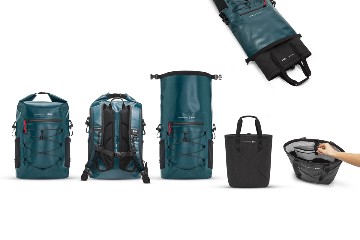 Visuale frontale, posteriore e interna degli zaini e borse impermeabili Groundtruth x PADI, con design modulare e dettagli tecnici per uso outdoor e subacqueo.