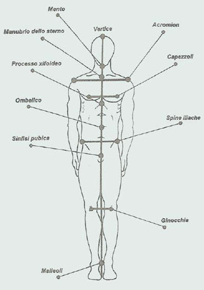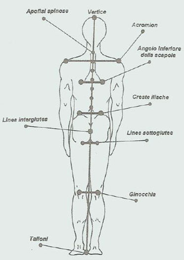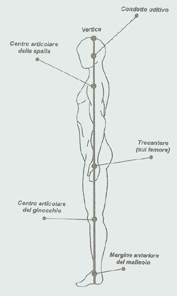Se facciamo cadere il filo a piombo posterioremente a partire dal vertice della testa, questo deve toccare la prominenza vertebrale (apofisi spinose), deve passare per le linee interglutee, centralmente nello spazio tra le ginocchia ed infine cadere tra i due talloni.