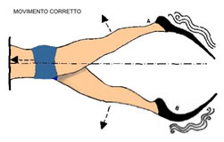 La pinneggiata determina un movimento degli arti inferiori molto diverso rispetto a quello della camminata. Per esempio la testa del femore ruota in maniera esattamente opposta all’interno della cavità acetabolare del bacino rispetto alla deambulazione. Quando si pinneggia il femore si sposta all’indietro grazie alla contrazione massima dei muscoli estensori della coscia, mentre quando si cammina si sposta in avanti. Questo è ovviamente un movimento poco fisiologico per il nostro corpo in virtù anche del fatto che ci muoviamo contro la resistenza dell’acqua. La gamba invece esegue un movimento simile a quello della deambulazione, ovvero una leggera flessione.