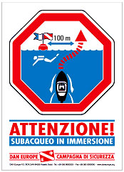 Il DAN Europe (Divers Alert Network) da anni promuove questa campagna mettendo gratuitamente a disposizione di chiunque ne faccia richiesta adesivi da attaccare nelle bacheche dei circoli nautici, nei diving, all’ingresso dei pontili nei porti turistici, nelle agenzie di noleggio di imbarcazioni o dovunque essi possano essere visti dal maggior numero di persone che conducono imbarcazioni nei luoghi di affluenza turistica e subacquea.