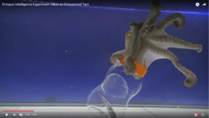 Gli autori dell’esperimento offrono al polpo un biberon con tappo a vite, e con dentro un pesciolino.