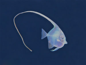 Mi sai dire che pesce è questo, lungo 4-5 cm escluso il filamento, fotografato durante una notturna a Raja Ampat?