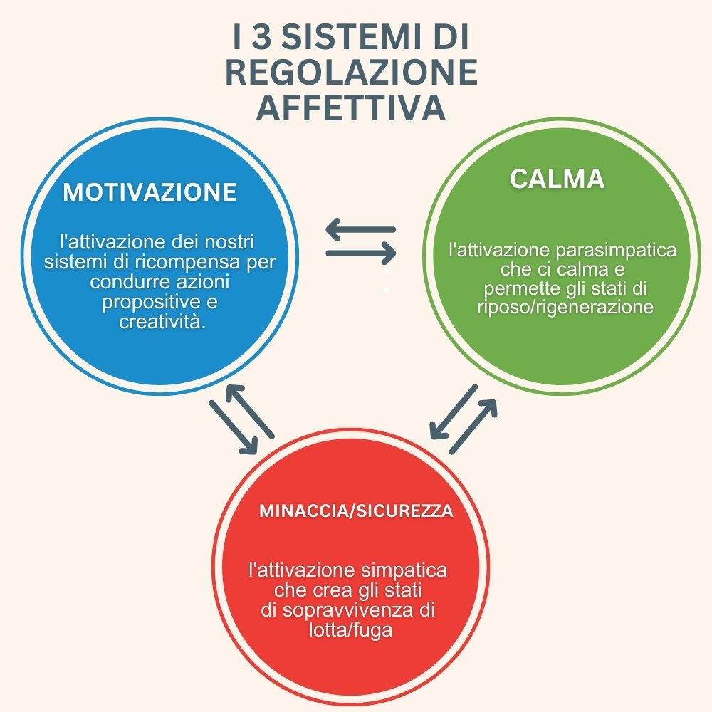 Pensa al tuo erogatore durante l’immersione. Cosa vuoi che faccia? Presumibilmente, vorresti ricevere il gas appropriato per quella profondità, ad una pressione che ti permetta di respirare n modo confortevole.  Se questo è ciò che ottieni, allora l’attrezzatura sta funzionando in modo efficace nel regolare l’erogazione. La regolazione della fornitura di gas è un processo adattivo, che cambia in base alla profondità e ad altre variabili. Anche il comportamento umano è regolato. Qui la meccanica è un po’ più complessa, ma l’obiettivo principale è lo stesso: che l’uomo riesca a fare cose, adattandosi in base alla situazione. Un utile concetto di regolazione emotiva è il modello dei tre cerchi di Paul Gilbert per lo stato affettivo. Gilbert descrive tre aree centrali della regolazione psico-fisiologica, che si adattano a seconda del contesto: