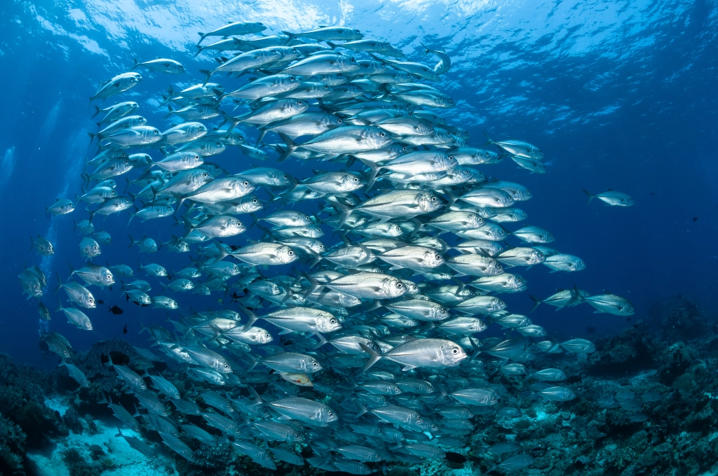 banco di carangidi che nuotano compatti nelle acque limpide di Raja Ampat