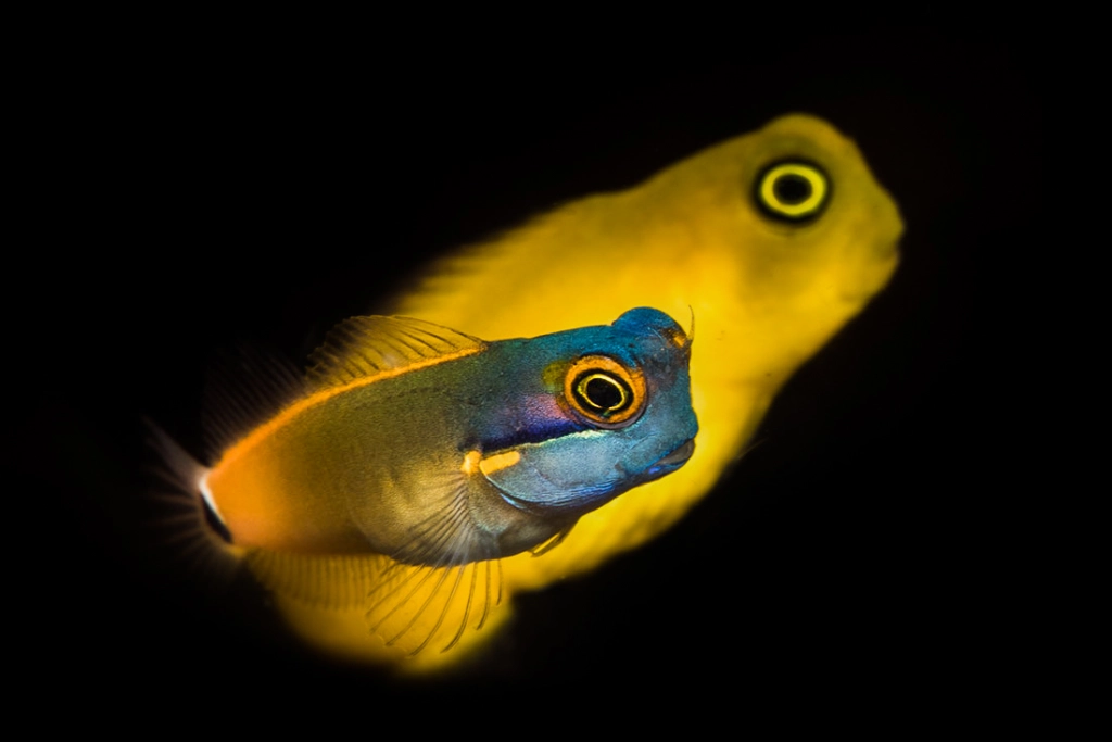 Primo piano di un piccolo pesce dai colori sgargianti, simbolo della vita notturna di Raja Ampat