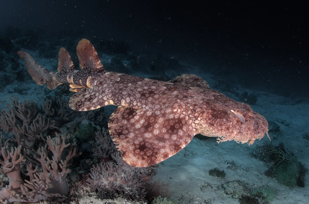 Esemplare di squalo Wobbegong adagiato sul fondale corallino durante un'immersione notturna