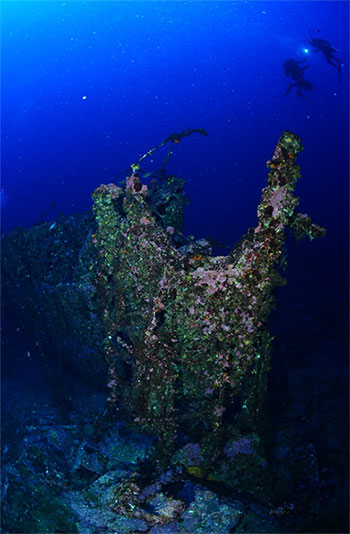 Il relitto visto dall’alto nella sua parte anteriore. Da notare quella che un tempo era la parte prodiera del cassero che oramai non c’è più, ed è ben visibile lo squarcio provocato presumibilmente da