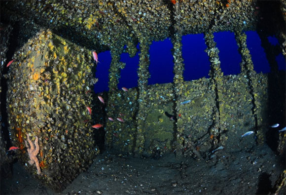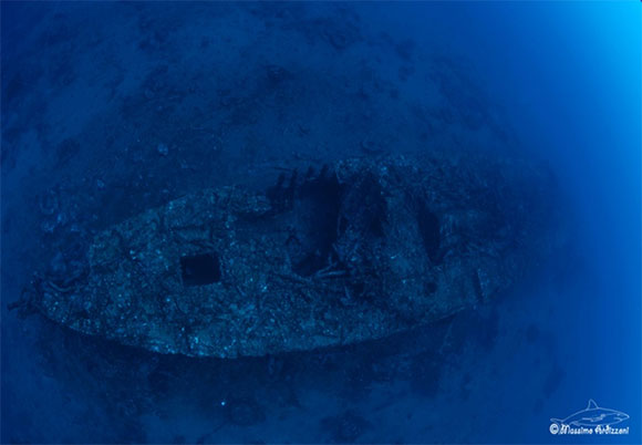provocato dall’esplosione di una bomba penetrata dall’alto. Il locale doveva essere una zona equipaggio e sugli RD armati poteva contenere la riservetta munizioni per il cannone da 76/40, sono infatti ben visibili due robusti armadi in metallo rimasti intatti. Da notare inoltre è la ossatura della nave con le amiere di cinta schiodate e rivolte verso l’esterno e verso l’alto per lo scoppio.