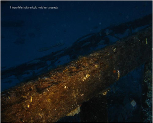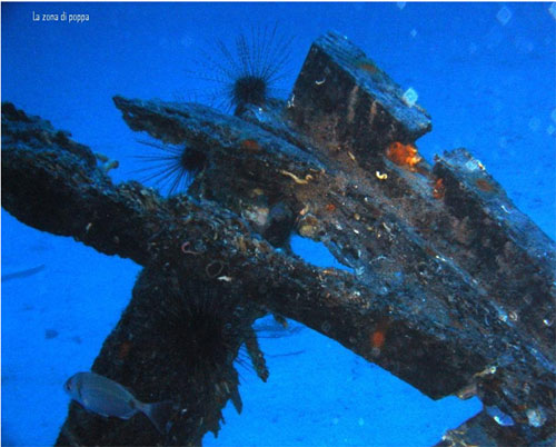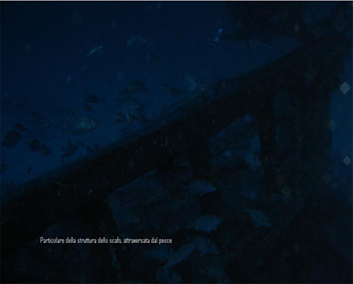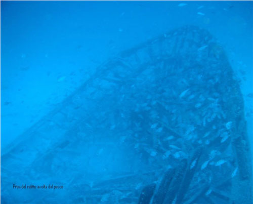 In particolare si può immaginare che l’incendio avvenuto a bordo del relitto, si sia sprigionato nella parte calpestabile, al centro dove si trovava l’equipaggio, e dopo aver bruciato le tavole di rivestimento, abbia fatto si che la entrasse acqua a bordo causando l’affondamento e salvando dal fuoco allo stesso tempo la struttura in legno costituente l’ossatura. Certo poi la permanenza in acqua di mare ha ultimato il lavoro consumando dapprima e più in fretta le tavole di spessore inferiore lasciando più integro lo scheletro. Vista da vicino la barca risulta essere di circa una ventina di metri di lunghezza, e lo scheletro è costituito da un intreccio di quadri di legno di circa 10 cm x 10 cm, e si trova adagiata su un fondale sabbioso a 51 metri di profondità in perfetto assetto di navigazione, lasciando immaginare che si sia inabissata continuando a mantenere la normale posizione di navigazione. La parte della prua, specialmente sul lato di dritta risulta la parte meno confusa e meglio conservata, ed è anche la parte dove si ammassavano i saraghi, le occhiate gli anthias le donzelle e tutto il pesce detto di “mangianza” che si aggirava li intorno.
