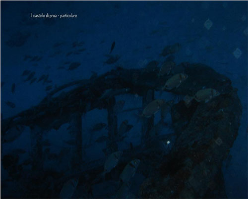 Ci siamo poi spostati verso il castello di prua per ammirarlo anche dal lato opposto e risulta anche li ben conservato e facilmente individuabile, e ad’una analisi del legno, il materiale risulta ancora in ottime condizioni, robusto e ben mantenuto, segno che nonostante i dieci anni dall’affondamento (dato fornito da Pino….. n.d.a.), ancora la salsedine non ha compiuto il proprio compito.