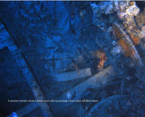 Tornando indietro per raggiungere il nostro pedagno, e tornare verso la superficie abbiamo potuto appurare che nella parte centrale della barca c’è ancora il motore, posto leggermente più accostato alla murata di sinistra in posizione rialzata, tipica fattura delle imbarcazioni tunisine; in particolare nonostante le varie incrostazioni è ancora ben visibile il volano e il coperchio dell’albero motore, lì in bella vista.