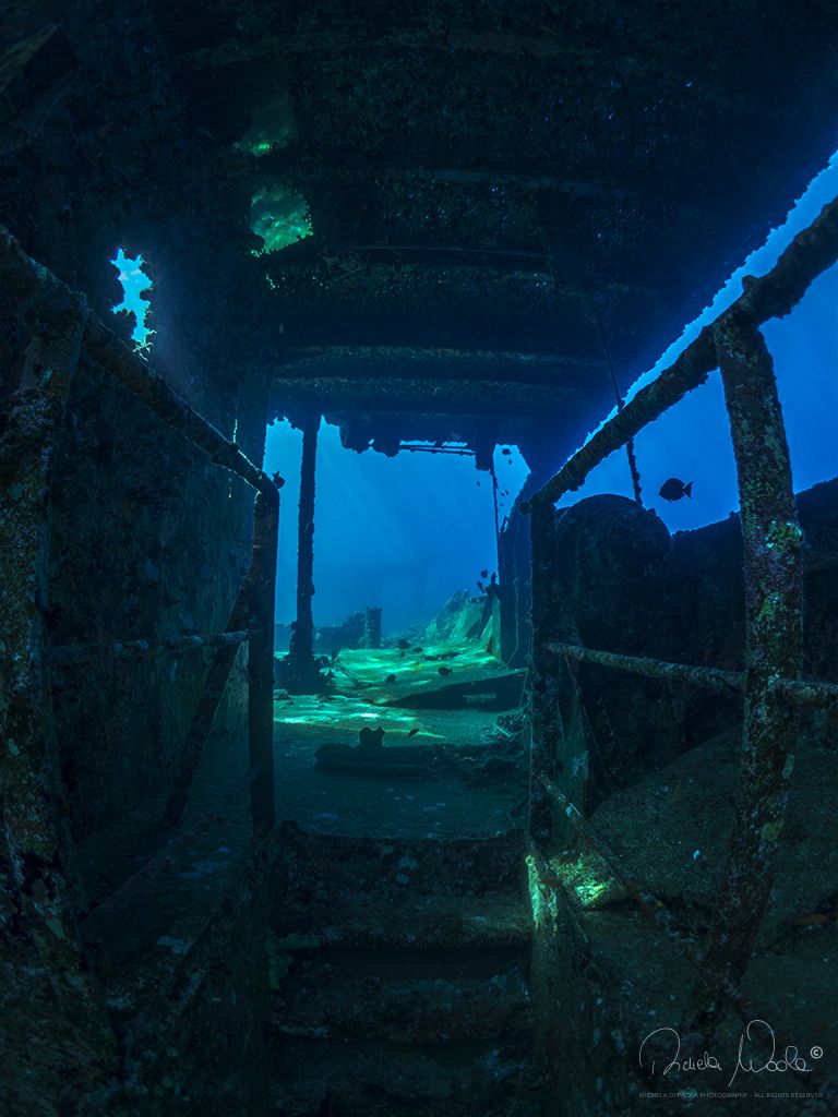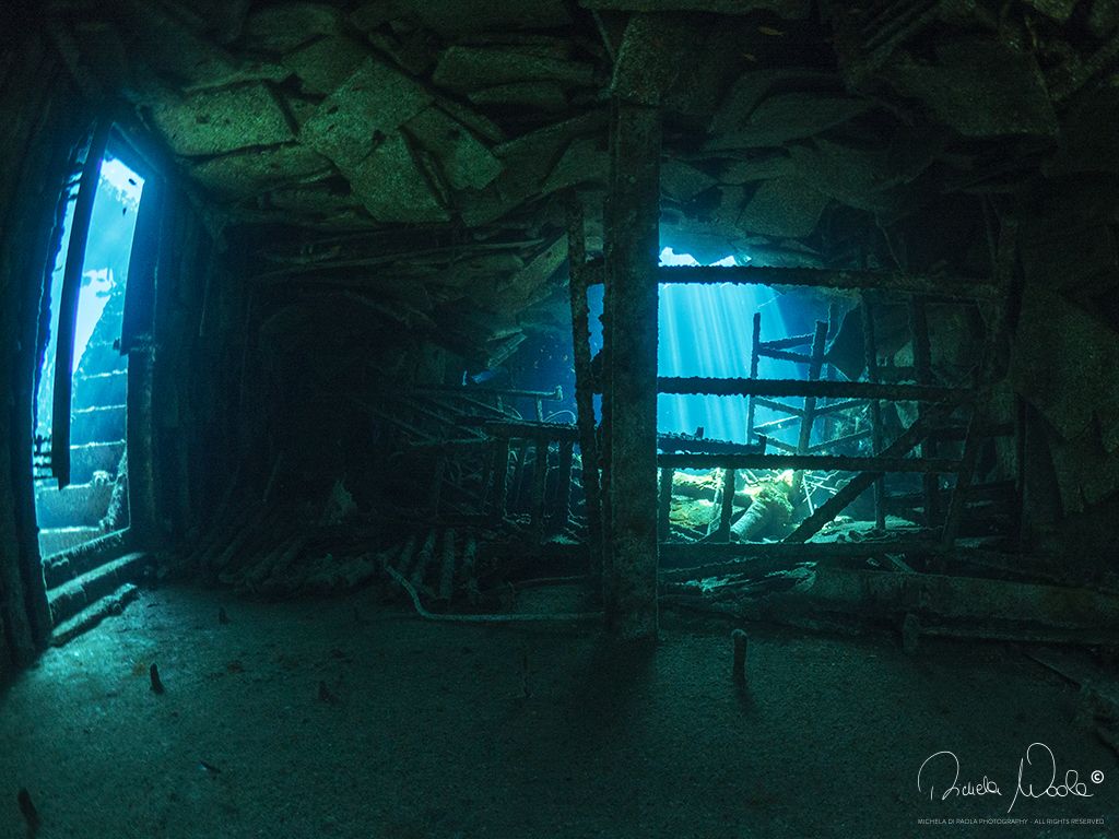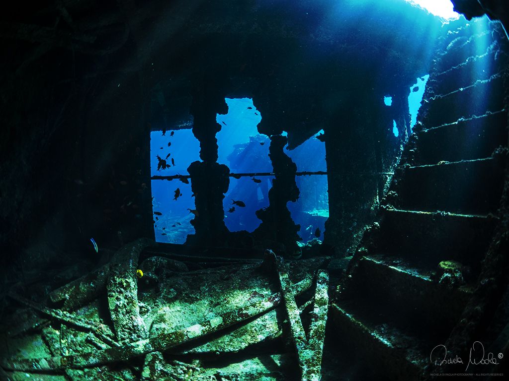Innalzandosi poi di qualche metro e dirigendosi in direzione del castello di poppa vicino alla plancia, la guida ci conduce nella zona degli alloggi, delle officine, dove è ancora possibile intravedere grazie alla luce delle nostre torce, vecchie scrivanie e telefoni, enormi chiavi da meccanico, fresatrici, smerigliatrici, testimonianze della vita umana all’interno del cargo. La giornata è soleggiata e l’abbondante luce che filtra dai numerosi oblò e squarci, rende l’atmosfera all’interno del relitto misteriosa magica e quasi irreale al tempo stesso, un luogo ideale per gli appassionati della fotografia come me. Nelle penombre dei passaggi tra un ambiente e l’altro sono molteplici le specie animali che hanno fatto di questo ammasso di ferro il loro mondo. Ora sta solo alla mia capacità fotografica ed alla mia sensibiltà, cercare di immortalare questo mondo e congelare le emozioni attraverso i miei scatti al fine di condividerle con amici, persone care o che condividono la mia medesima passione. Gli scatti susseguono uno dopo l’altro fino a quando, lo scarseggiare dell’aria nella bombola rende necessaria la procedura controllata di risalita in superficie.