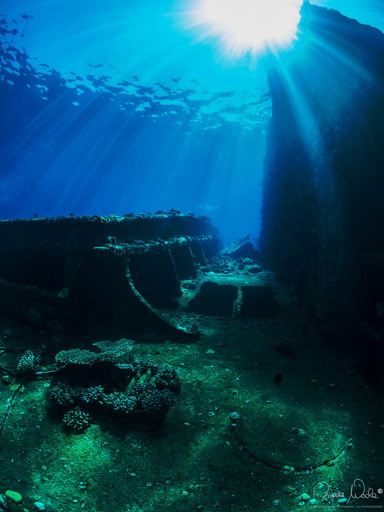 Un ambiente misterioso che non appartiene al mondo esterno, dove io sono l’ospite e al quale devo portare un enorme rispetto. Durante la discesa in profondità dove le immagini si mescolano e l’unico riferimento rimane la luce del sole, diventiamo testimoni di una tragedia del passato; sott’acqua il tempo si ferma, il silenzio e l’immobilità permangono intorno a noi, ci sei solo tu che in compagnia dei tuoi buddies rimani stupito dai resti di questo grande testimone della storia. Iniziamo a nuotare lungo la murata di sinistra dell’enorme nave che difficilmente si riesce a scorgere nella sua totalità, e superiamo la zona squarciata dall’impatto, penetrando all’interno dello scafo e delle stive.