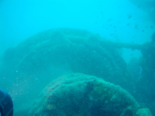 Decisamente sono ben visibili anche gli effetti del tempo: ottant’anni sotto il mare hanno pian piano eroso le strutture, ed hanno trasformato le parti metalliche in una sorta di barriera corallina, tutte incrostate di spugne, briozoi e qua e la hanno costituito la tana per pesci o crostacei di tutti i generi.
