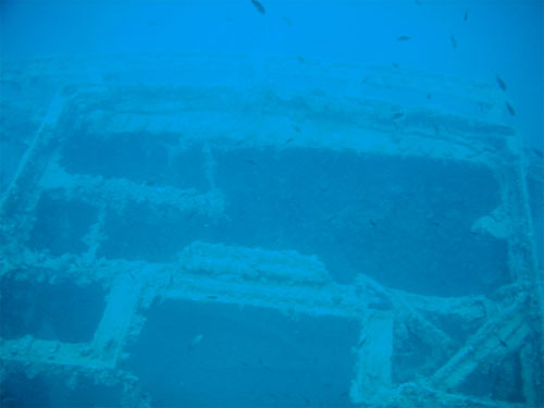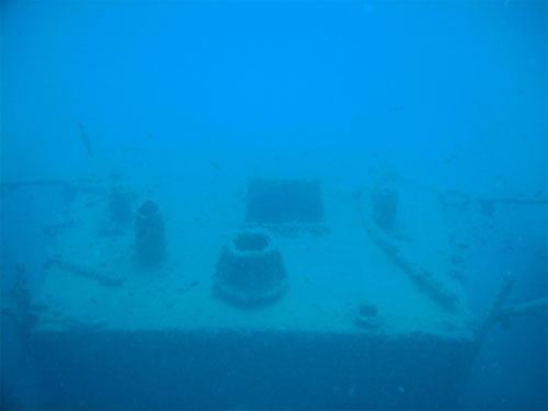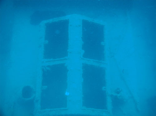 Torniamo quindi a salire un po’ e ci dirigiamo verso poppa per visitare tutte le strutture ancora presenti, lasciando la visita della prua squarciata dall’esplosione al termine prima della risalita. La visita alla parte di poppa svela subito dietro il ponte di comando, il castello di comando, ormai vuoto e privo di comando o strumenti di manovra, ma ancora intero nella struttura e con tipiche aperture rotonde laterali da oblò; poi a seguire la sala macchine, che in realtà risulta allo stesso livello degli argani di prua, e reca una copertura superiore sul ponte tipo “tetto di casa” con quattro luci, struttura molto caratteristica e molto ben riconoscibile. Segue poi una parte di ponte con ancora intatta la copertura e con bitte, maniche a vento e camini un po’ dovunque sino ad arrivare alla coda. Qui invece le coperture del ponte sono crollate e permettono di vedere lo scheletro del telaio e lasciano intravvedere le stive sottostanti.