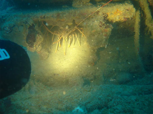 A questo proposito infatti, a prua nelle lamiere divelte dall’esplosione, vive quasi a livello del fondo un’aragosta di generose dimensioni, che ha trovato un valido rifugio dove ripararsi dai predatori. E’ tempo, purtroppo, di avviarsi verso il gavitello per la risalita e di lasciare il relitto alla custodia delle acque; durante la risalita e la doverosa sosta a cinque metri controllo le foto scattate poco prima ed in effetti oltre all’evidente sospensione che limita la visibilità, si riesce a percepire sia il fervere del lavoro durante la navigazione, sia la drammaticità dei momenti che sono susseguiti al siluramento ed all’affondamento del bastimento.