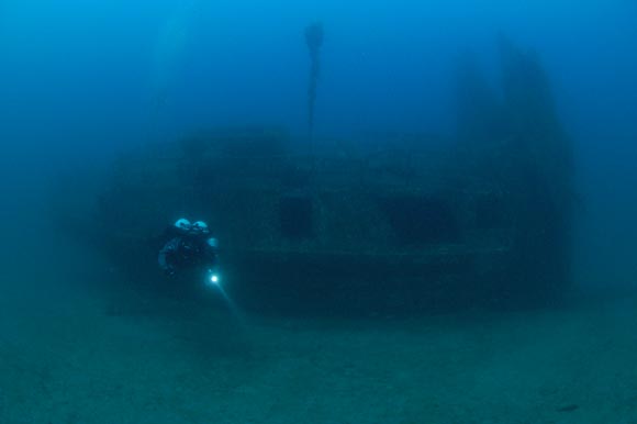 Bene appena tutto pronto ci imbarchiamo sul Bat 5.90 di Mariolino e procediamo verso il punto… ci attendono 20 minuti di navigazione, con un mare forza 2/3 da maestrale, la navigazione si fa più lunga del previsto, inizia ad apparire nei nostri volti un po’ d’ansia nella possibilità di riuscita dell’immersione viste le condizioni, ma non demordiamo e continuiamo. A 3 minuti dal punto Mariolino ci avvisa d’iniziare a prepararci, do le ultime istruzioni a Ben soprattutto sulla sicurezza e sulle procedure d’emergenza da attuare se qualcosa dovesse andar male, vedo Ben un po’ affaticato in volto vista l’onda e lo spazio ridotto del gommone ma è un diver del nord Europa è abituato ad onde molto più grosse a temperature più basse e a visibilità ridottissime, quindi non mi preoccupo ed infatti esattamente 3 minuti siamo pronti al tuffo, bombole di fondo aperte controlli effettuati e stage decompressive collegate all’imbraco. Mariolino rallenta tiene un’andatura lenta e costante tiene in mano il pedagno mobile pronto ad essere lanciato, pochi secondi e via corre giù verso il fondo velocissimo, tempo di un parlato una virata e Mario da l’OK per il tuffo. Siamo in acqua, l’onda è molto fastidiosa non ci si capisce con le parole ma non c’è problema due segnali e via giù seguendo a vista il nostro pedagno mobile meno di 30 secondi ed con una visibilità di 20 metri la sagoma completa del peschereccio in tutta la sua bellezza è una sinfonia di colori e sensazioni senza eguali, vedo negli occhi di Ben l’entusiasmo e la felicità per la scoperta, non siamo sicuramente i primi a vedere il relitto del N1 ma sicuramente siamo i primi a vederlo in tutta la sua bellezza.