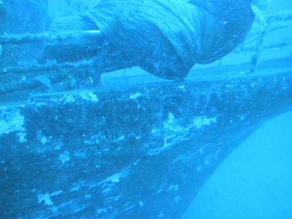 Controlliamo la possibilità di penetrare all’interno del peschereccio ma oggi non mi sembra il caso sono numerosissime le reti al suo interno quindi molto pericoloso per la nostra sicurezza, continuiamo a visitare il lato dritto e qua riusciamo a vedere la chiglia, arrivati sulla zona di prora vediamo finalmente il punto d’impatto perfettamente sulla prora dritta abbiamo 4/5 fasce di legno inclinate verso l’interno, è la falla che ha mandato affondo il Number One tre anni prima, è triste vedere quanto basta poco per rimanere senza barca sotto i piedi e pure è cosi!!! Scostato di circa 5/6 metri sulla prora dritta il tettuccio della plancia di comando con la tromba in posizione, siamo lieti di vedere che tutta la struttura ospita un bellissimo astice, continuiamo uscendo circa 10 metri fuori dalla prora è impressionante il panorama che si apre di fronte a noi, la prora del N1 che si scaglia alta e fiera in mezzo al mare torniamo indietro incontro alla prora e sulla prora dritta con grande compiacimento si legge chiaramente il nome del peschereccio “NUMBER ONE” fantastico! Mancano circa 8 minuti alla risalita e con Ben che infila la torcia dappertutto decidiamo di dedicarci alla coperta si esplora la plancia, il fatto che siano presenti tutti gli oggetti che arredano una plancia è un chiaro segnale che sono pochissimi i sub che si sono immersi su questo relitto, si trova anche la pipetta dell’olio del motorista !!!