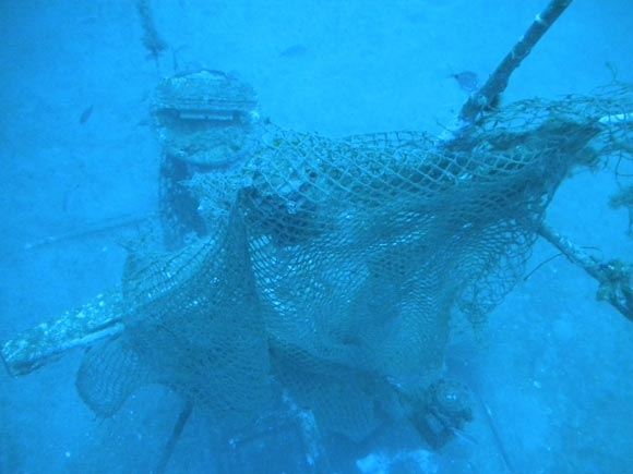 Il relitto si presenta in assetto di navigazione sbandato di circa 15/20 gradi sul fianco sinistro la prora orientata in direzione di Porto Torres perfettamente integro e già colonizzato. La copertura della plancia di comando è stata divelta sicuramente dalla collisione ma ancora non localizziamo il punto d’impatto, siamo scesi sul centro sinistra a circa 12 metri dal relitto spostiamo il pedagno verso il relitto, sul fondo su tutto il lato sinistro ci sono numerose triglie di sabbia di enormi dimensioni decidiamo di andare verso poppa ed incontriamo la tana di un grosso astice. vediamo eliche e timone tutto ok alzando la testa ci lascia a bocca aperta il sistema di pesca con tutte le reti ancora in posizione, è evidente che il peschereccio al momento dell’impatto stava salpando le reti, infatti oltre a risalire dalla poppa fino ai 30 metri di profondità ci sono anche una quindicina di metri distesi sul fondo, è uno spettacolo ammirare all’interno delle reti che hanno creato un vero e proprio acquario immerso, infatti sono numerosi i saragheti all’interno della rete che sembrano intrappola ormai catturati, invece ironia della sorte ormai fa da parco giochi a saraghi, castagnole, merluzzi.